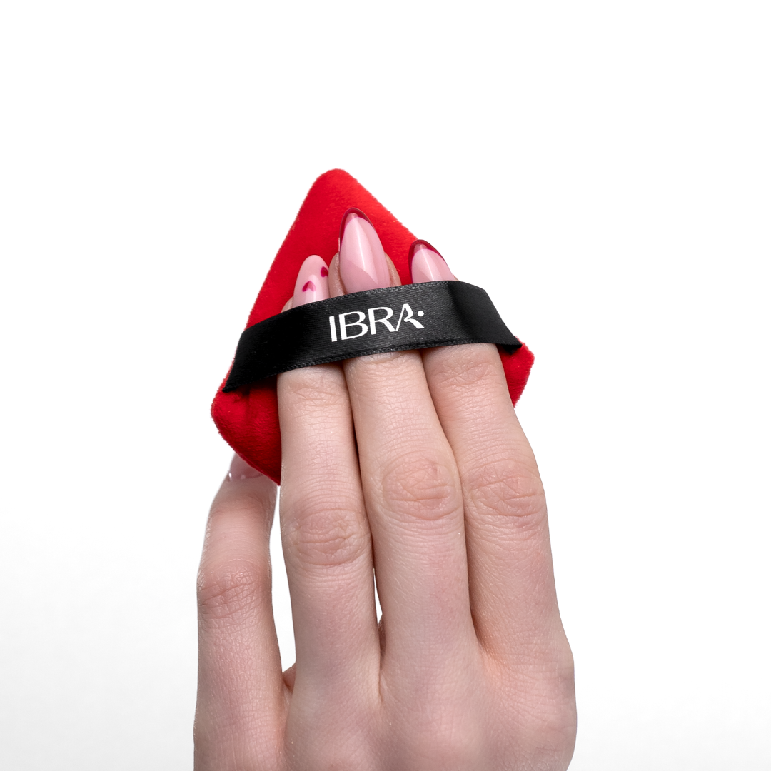 Puszek do pudru w kształcie trójkąta marki Ibra Makeup.