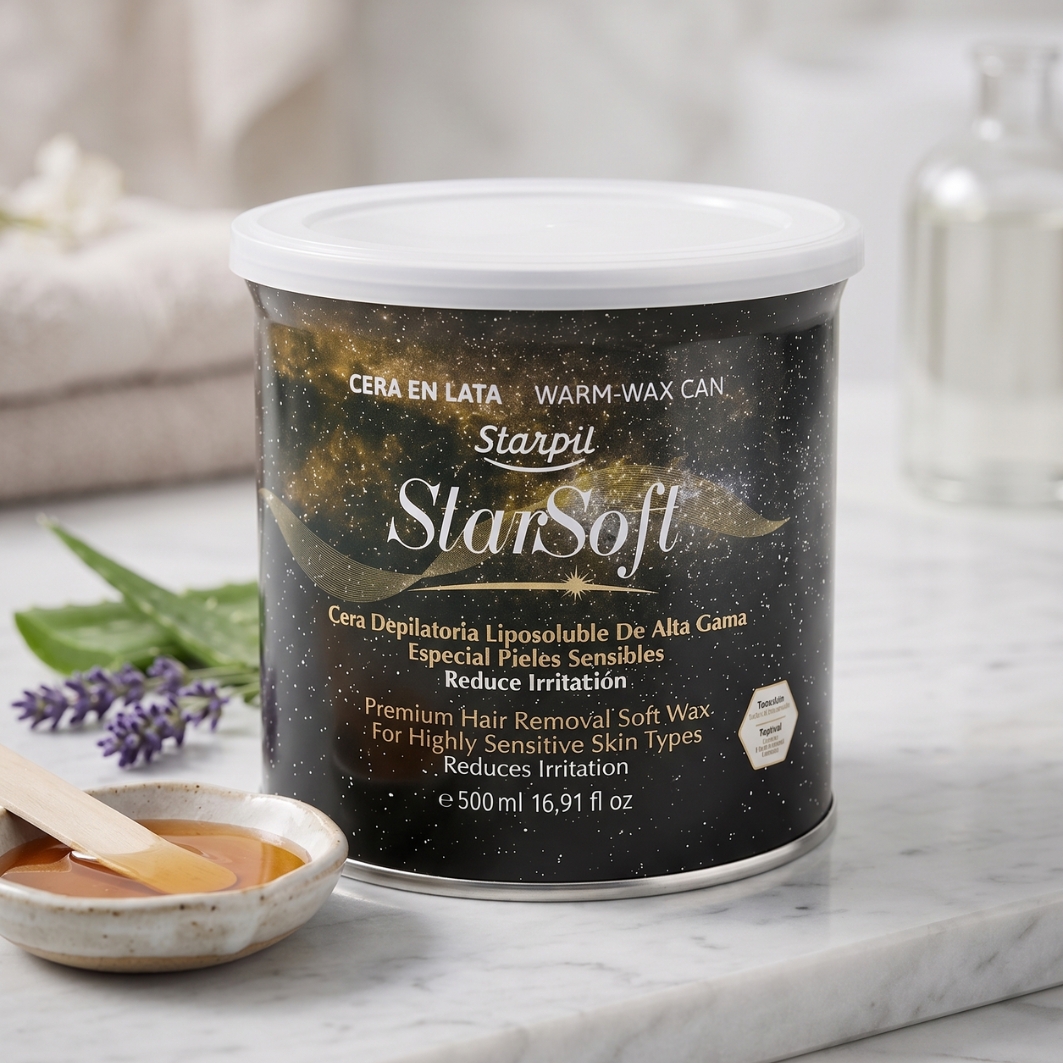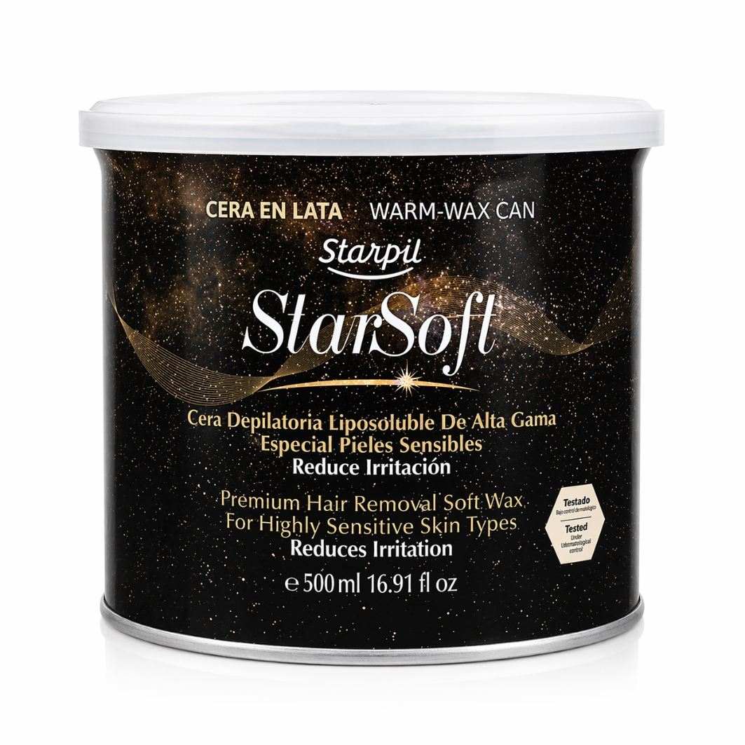 Star Soft Soft Wax to flagowy wosk miękki w puszce z ultradelikatnej linii marki Starpil, stworzony z myślą o profesjonalnych salonach kosmetycznych. Depilacja za pomocą tego wosku i pasków flizelinowych staje się znacznie mniej bolesna i łagodniejsza dla naskórka. Dzieje się tak za sprawą obecności innowacyjnego składnika aktywnego, który hamuje przewodnictwo impulsów nerwowych odpowiadających za uczucie pieczenia i bólu.